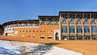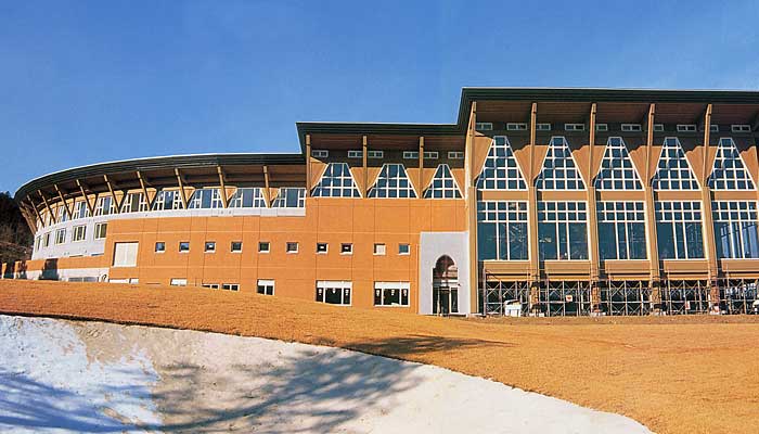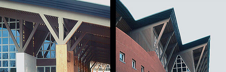 Photo left: Exterior of golf club in Japan: custom designed wood beams in pine were laminated to each produce a span of 90 linear feet. Entire building was built with wood. Photo right: window and roof details with support beams