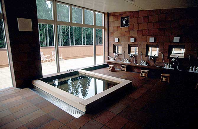 Traditional Japanese bathhouse for golf club guests. Bath is 36" deep, 5-prep/wash stations displayed on far wall