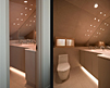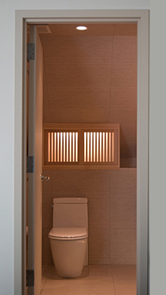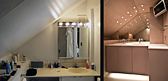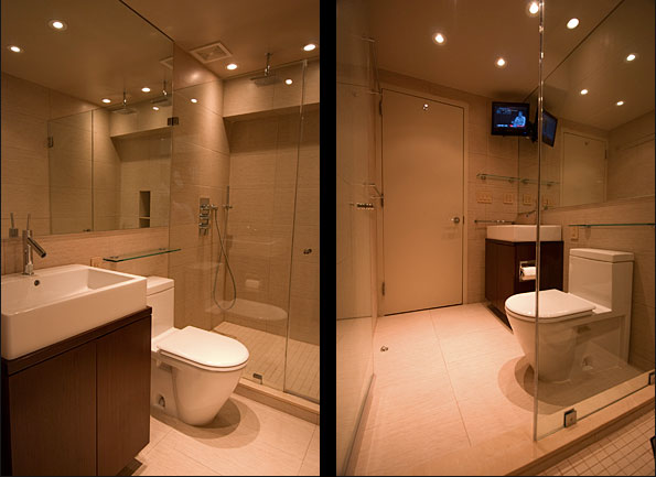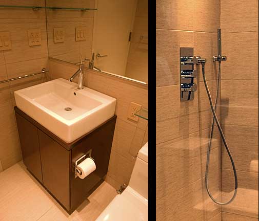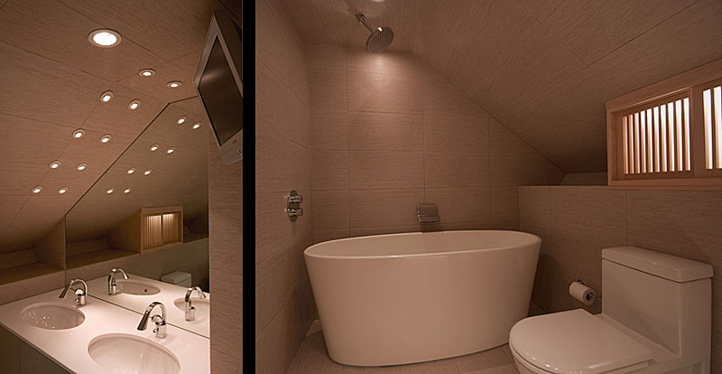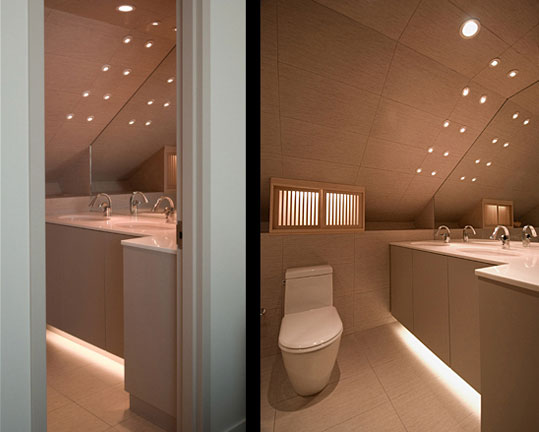 Two views of bathroom, under-cabinet light provides illumination at night w/o turning on main lights. Cabinet light provides same function. Compact Duravit/Starck toilet is shown