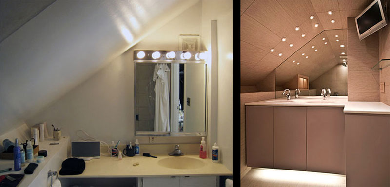 Photo Left: bathroom was extremely tight with low slanted ceiling and corrugated metal roof. Little room between sheet rock and roof.