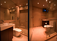 Photo Right: The goal was to make the bathroom appear much larger than it was, this included: tiling ceiling and walls, installing a one-piece mirror, recessed sinks, no splash, wrap-around custom cabinet, neutral color palette, adjustable mini-downlights over sink