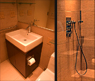 Photo left: bathroom is tight, fittings, shelves, sink, cabinet are positioned precisely