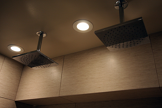 Up-view angle of dual Hansgrohe rain showers and waterproof downlights, blocked out vent in back