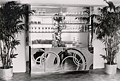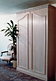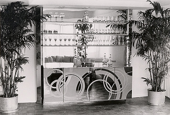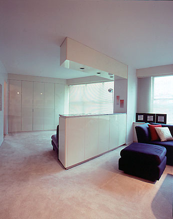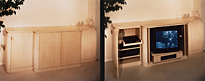 Custom made media cabinet with polished travertine top, white ash wood matched to top. Client insisted on keeping analog media equipment. Automated doors, shelf and swivel are all operated by remote control