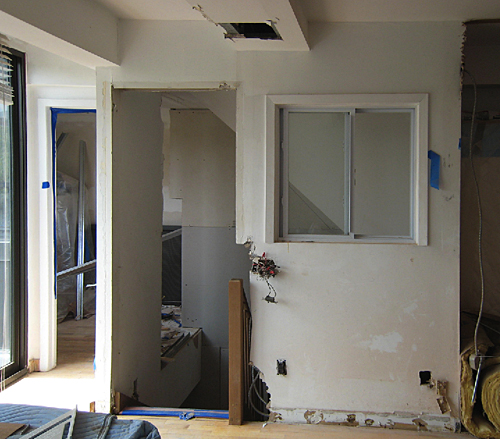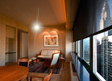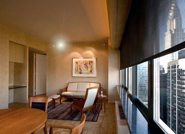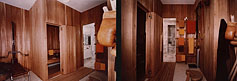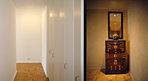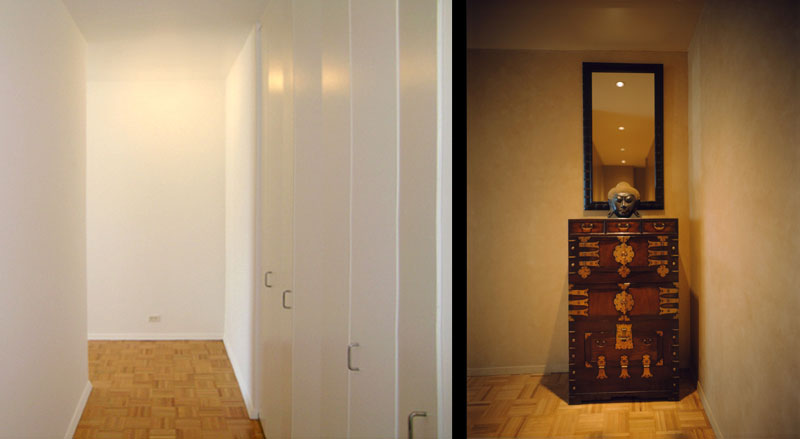 Photo left: illustrates typical New York entry/hallway with closets on right side. To make it dynamic, Photo right: shows the walls were painted in 3-tones, also utilized client's Chinese cabinet and mirror. For a focal point we used a Thai Buddha mask & four downlights
